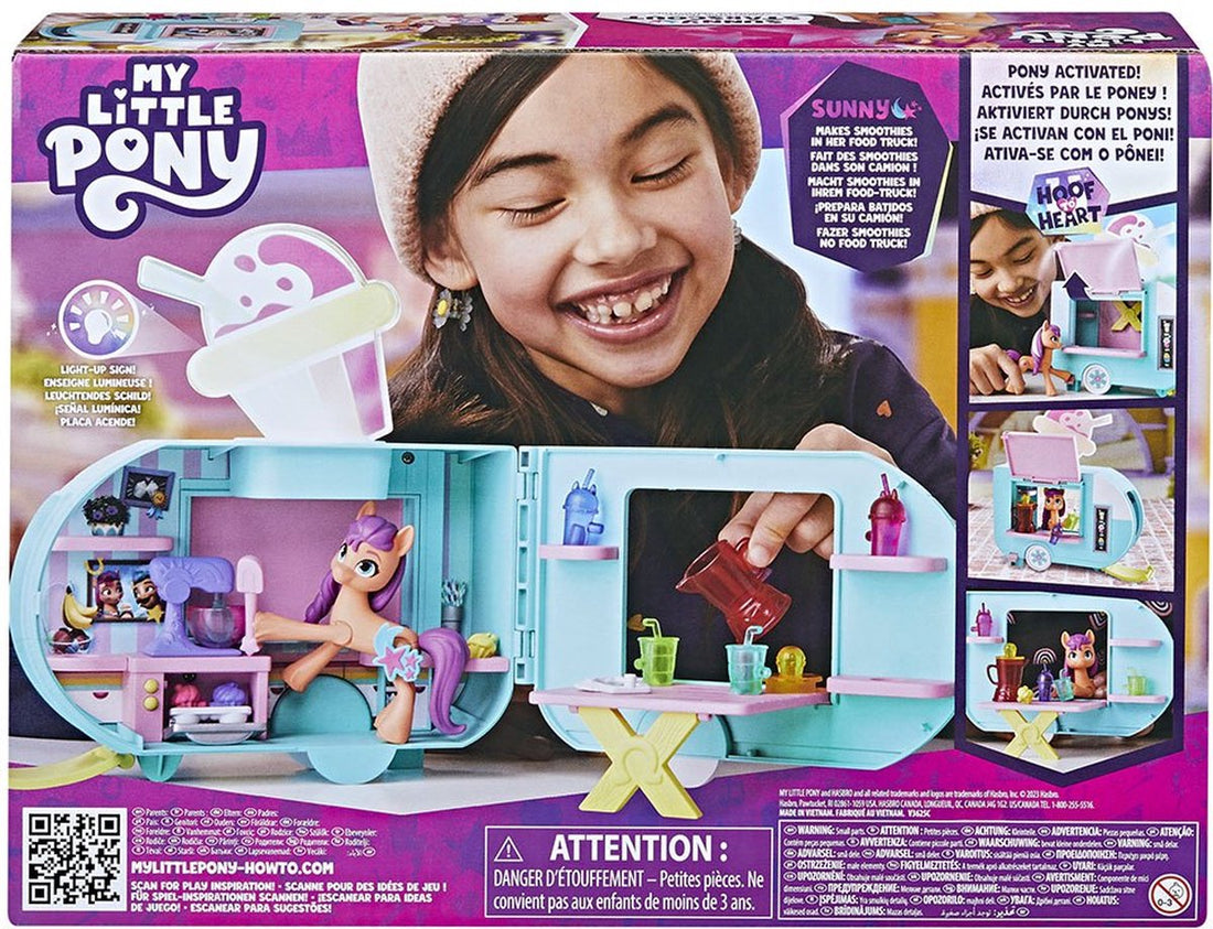 Serveer een flinke dosis magie met de Sunny Starscout Smoothie Truck! In Make Your Mark rijdt Sunny als avontuurlijke Earth Pony door Maretime Bay om iedereen te trakteren op zoete lekkernijen. Deze 2-in-1 speelset verandert van coole foodtruck naar een volledige speelkeuken — klaar voor smoothies, cupcakes en fantasiespel.