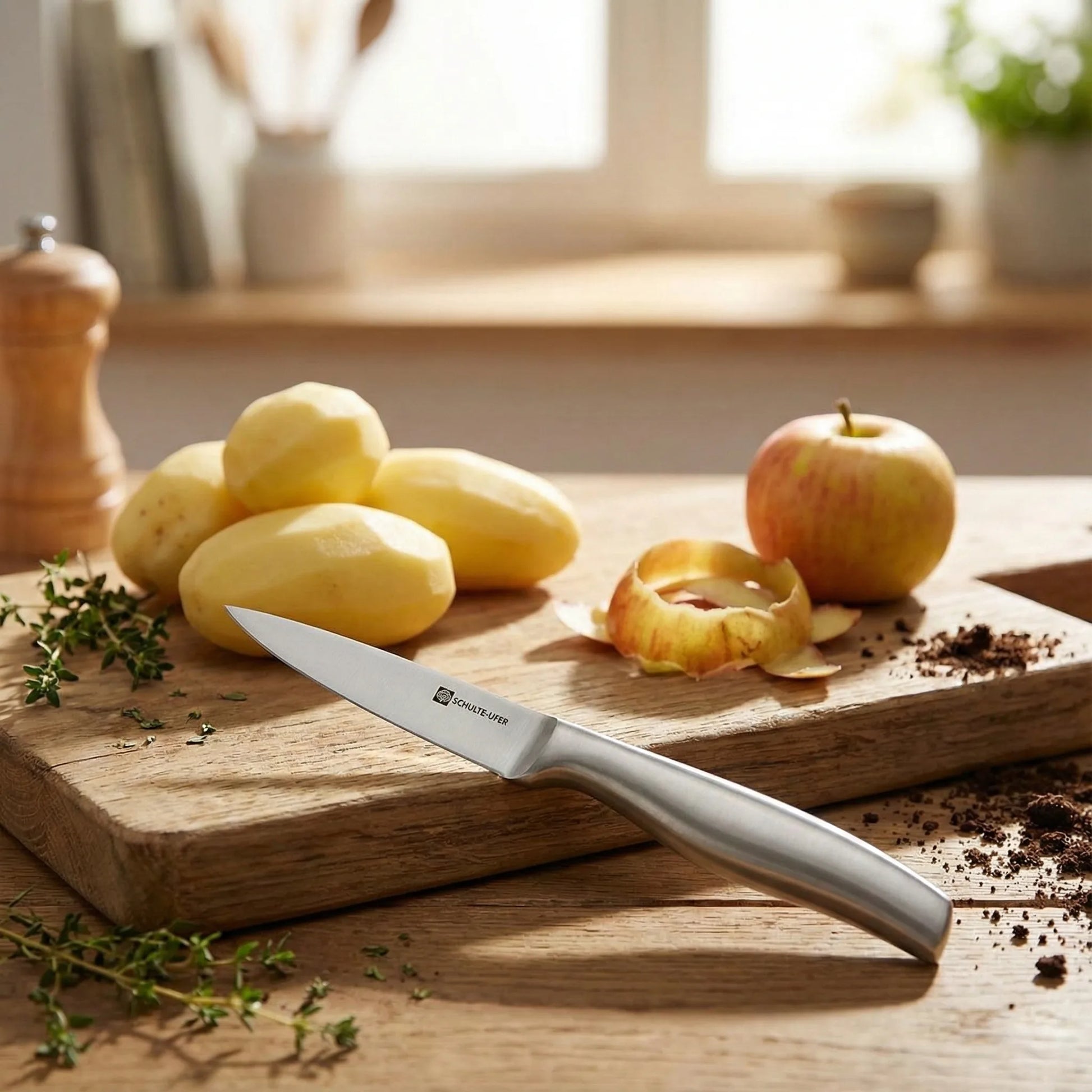 Compact, scherp en hygiënisch: het Schulte Ufer schilmes is perfect voor precisiewerk. Ideaal voor groenten, fruit en kleine snijtaken.